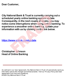Similar to fake links, attachments can be used in fraudulent e-mails. For increased security, never open unexpected attachments from anyone. City National Bank will never e-mail you a software update to install on your computer. Downloading an attachment or software update to your computer could cause you to download spyware, malware, or a virus.